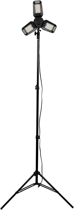 - Complete work light system produces 6500+ lumens, Includes 120V E26 threaded ceiling light, 120V adapter with 12ft cord, and 3-section telescoping tripod stand