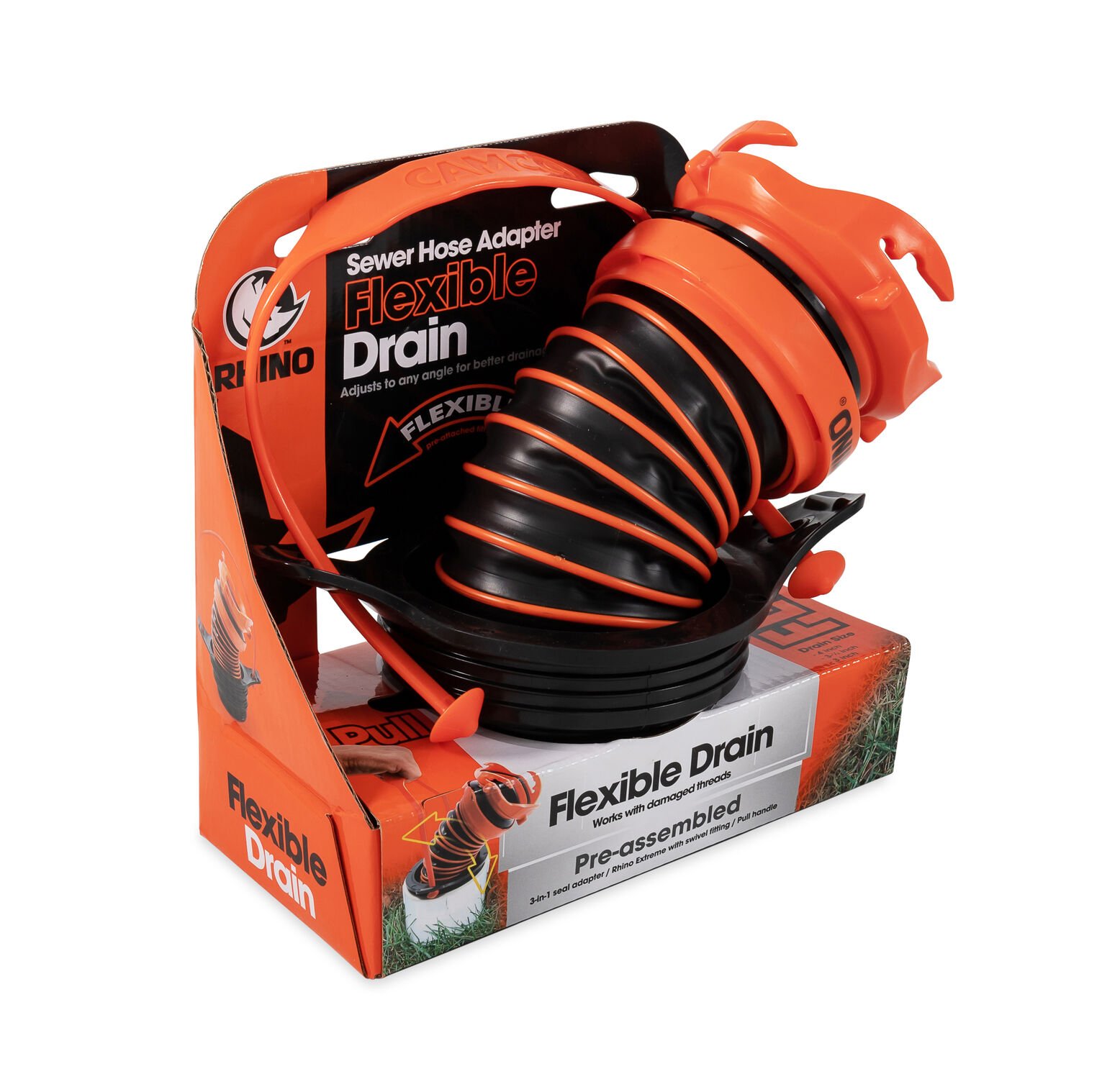 • The Rhino Sewer Hose Adapter Flexible Drain includes a pre-assembled Rhino Extreme hose with a 360-degree swivel bayonet fitting, a 3-in-1 seal adapter and a pull handle