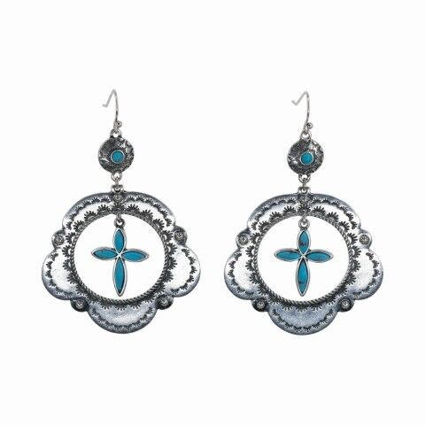 • Concho Hoop With Stone Cross On Small Pendant With Faux Turquoise Cross Charm