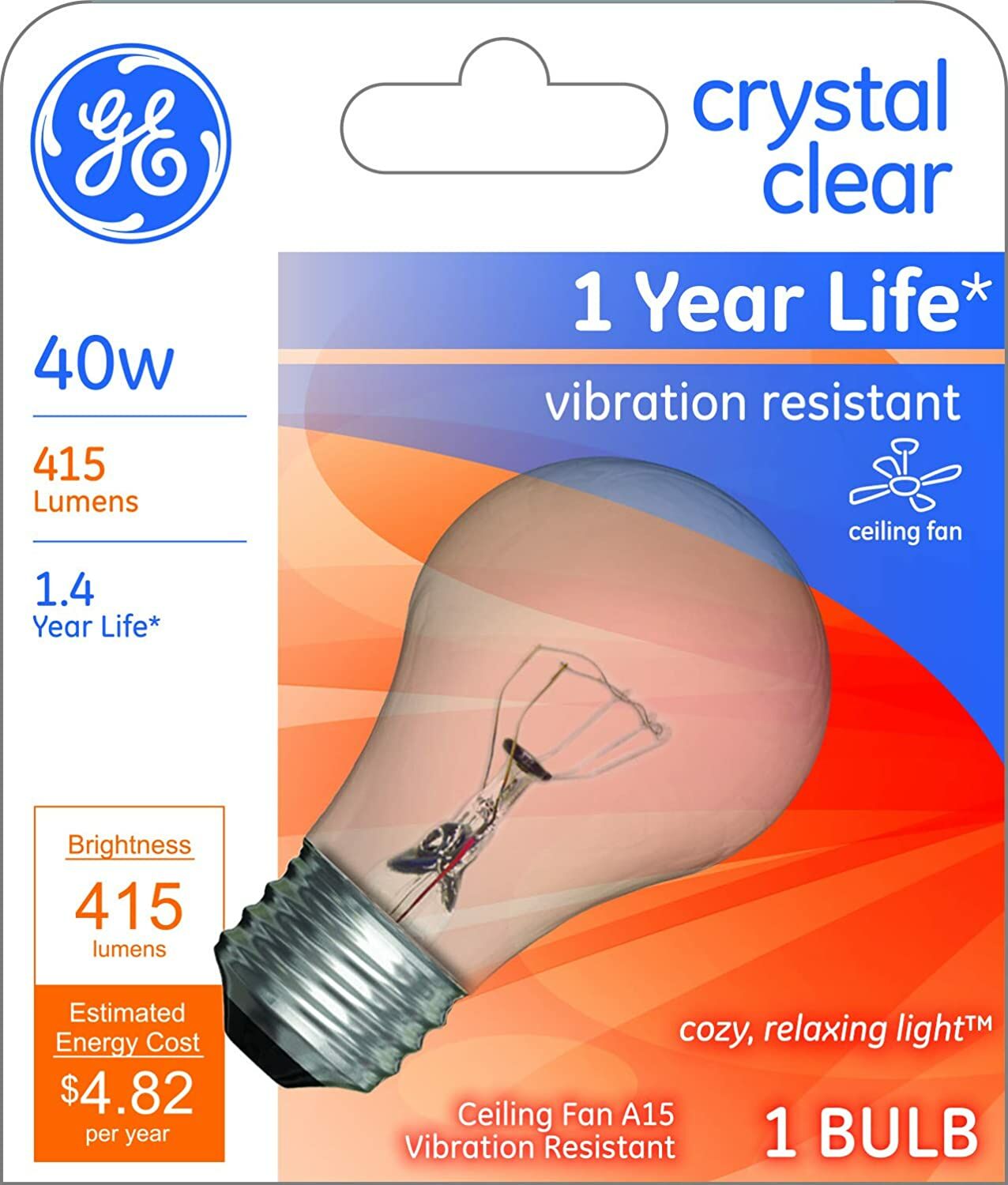 GE Crystal Clear Incandescent A15 Light Bulb, 40-Watt, 415 Lumen 1-Pack