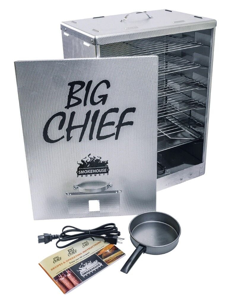 - The Big Chief Front Load Smoker includes... Smoker, of course, with 5 Easy-slide Chrome plated grills, electric cord, drip pan, wood flavor pan, and Free Recipe Booklet and complete operating instructions