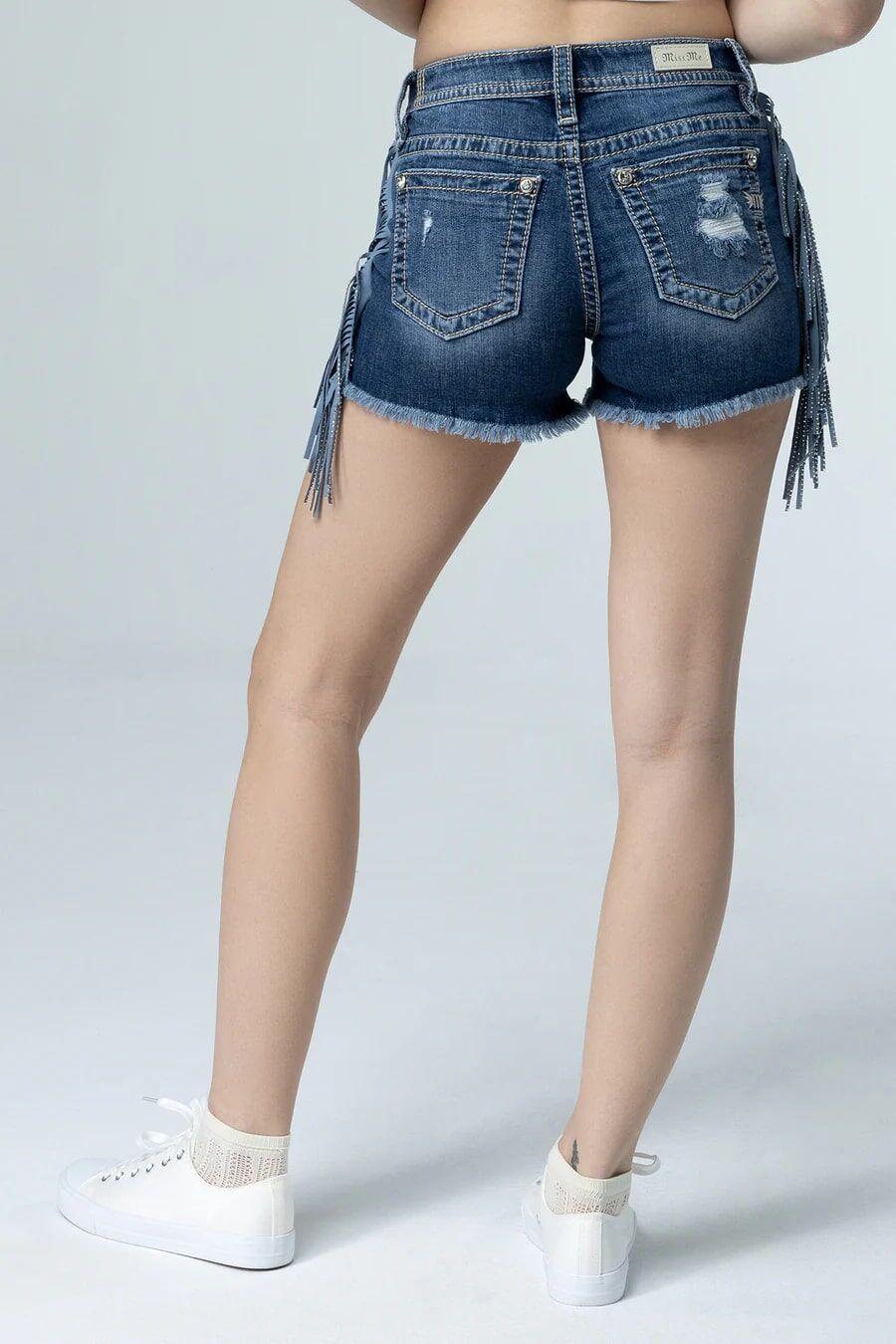 - Blue suede embellished fringe design on both sides of shorts
