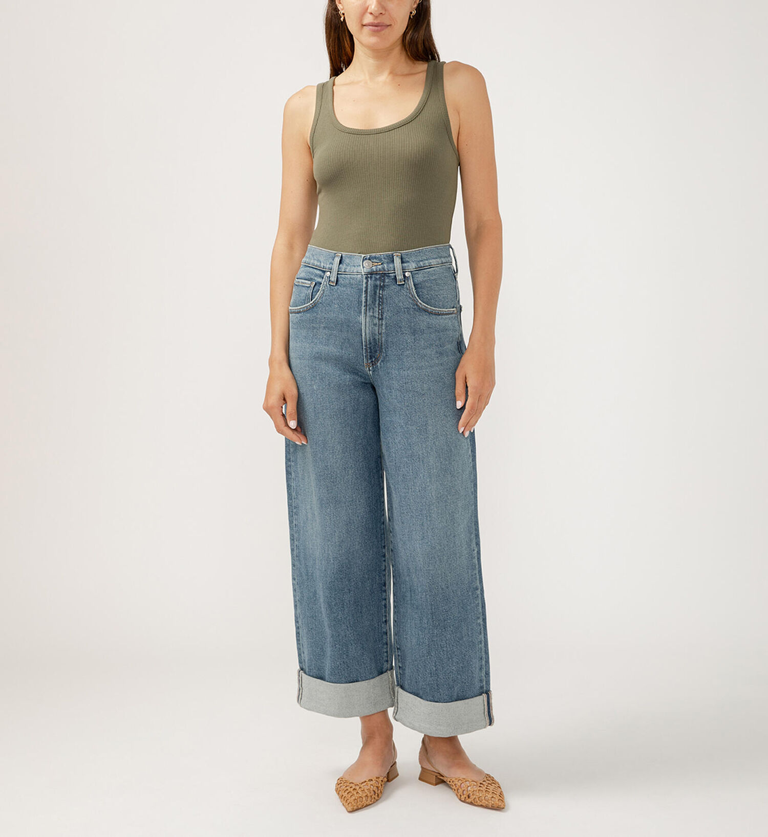 • Wide leg jeans in a medium indigo wash